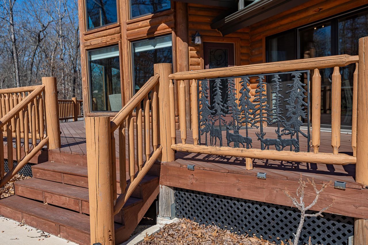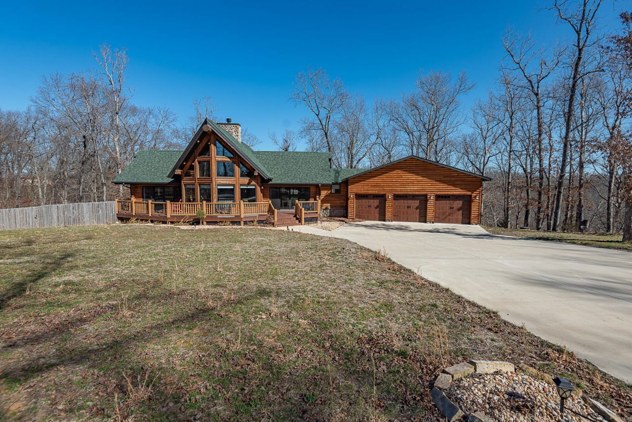 This remarkable log home is tucked away on 4.9 acres in the west side Saddlebrooke neighborhood of Oak Terrace. True craftsmanship abounds in this 2022 custom built log home with 3 bedrooms, 2.5 baths and a 3 car garage. The impressive great room boasts a cathedral ceiling with a 30' woodburning stone fireplace, 8' log walls and windows galore to view nature's wonder. The modern style kitchen is equipped with a generous dining area, quartz counters, stainless appliances, a center island and a walk-in pantry nearby. The large primary suite offers a wall of windows, access to the front deck and a luxurious bathroom with dual sink vanity, a step-in glass shower, a relaxing soaking tub and a walk-in closet. Descend to the walk-out basement where you are greeted with a second living area that is perfect for movie nights and family fun. Two more large bedrooms are situated on opposite sides of the basement. Both bedrooms contain abundant closet storage and have large windows to enjoy the scenic view. Another full bath is located here too. The bonus storm room also serves as an exercise area or additional storage. Inside of the 3 car garage is a huge 13'x32' heated and cooled work shop room. Do with this what you would like because the possibilities are endless. Outside there is extensive decking to enjoy all the throws of nature. A privacy fenced side yard is the perfect area for kids play or pet safety. Enjoy the peace and tranquility of your private oasis surrounded by wildlife in the quiet wooded setting on a cul-de-sac road. Private yet convenient to Hwy 65 situated between Ozark and Branson close to the National Tiger Sanctuary, Busiek State Forest and the Mark Twain National Forest. Dream big because this home can be yours!