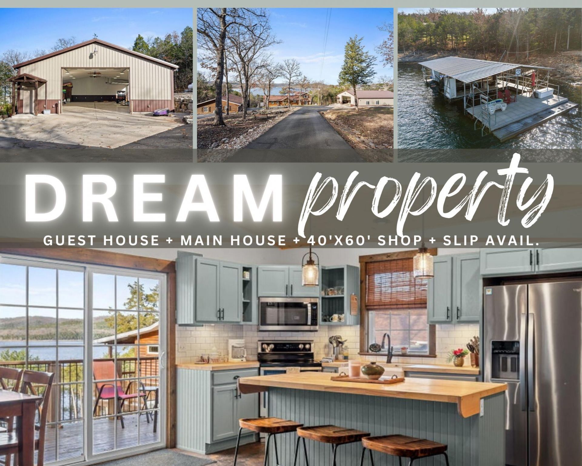 Waterfront Multi-Family Estate | Walk to Shoreline | Private 2.7± Acres | Hyde's HollowA rare opportunity on Table Rock Lake--this private waterfront estate in Hyde's Hollow delivers the ultimate blend of multi-family living, walk-to-the-water access & peaceful seclusion. Set on 2.7± wooded acres w/375± ft of shoreline, this legacy property offers unmatched privacy, panoramic lake views & room for everyone to gather while still having space to retreat.Tucked beneath a canopy of mature hardwoods, the property unfolds into a main log home, separate guest house & 40x60 shop--creating the perfect setup for multi-generational living, hosting extended stays or creating income potential. The circular drive welcomes you into a quiet, nature-filled setting where lake days are just a short walk away.The main home showcases warm log cabin character, anchored by a dramatic rock wood-burning fireplace & open-concept living designed for connection. Expansive windows frame the lake, bringing the outdoors in. The kitchen offers generous prep space & flows seamlessly into dining--ideal for large gatherings. Main level features 3 bedrooms including a private owner's suite, plus a second living area or office. Upstairs bunk room adds flexible sleeping space, while the lower level rec/playroom creates even more room to spread out.The guest home offers its own private haven w/full kitchen, garage & hot tub overlooking the lake--perfect for in-laws, guests or rental use without sacrificing privacy to the main residence.Outdoors, enjoy a handcrafted waterfall & splash pad, raised garden beds & multiple spaces to relax after a day on the water. Walk directly to the shoreline for easy lake access, fishing or launching your next adventure.Additional highlights: whole-home generator, low-maintenance landscaping & ample space for lake toys in the 40x60 shop.Waterfront. Walk-to-the-water. Multi-family flexibility. True Ozark privacy. Interactive Tour Links: Main Home: https://my.matterport.com/show/?m=r4sDZ593SDa&brand=0&mls=1&Guest Home: https://my.matterport.com/show/?m=Qg6bD9QAjQh&brand=0&mls=1&