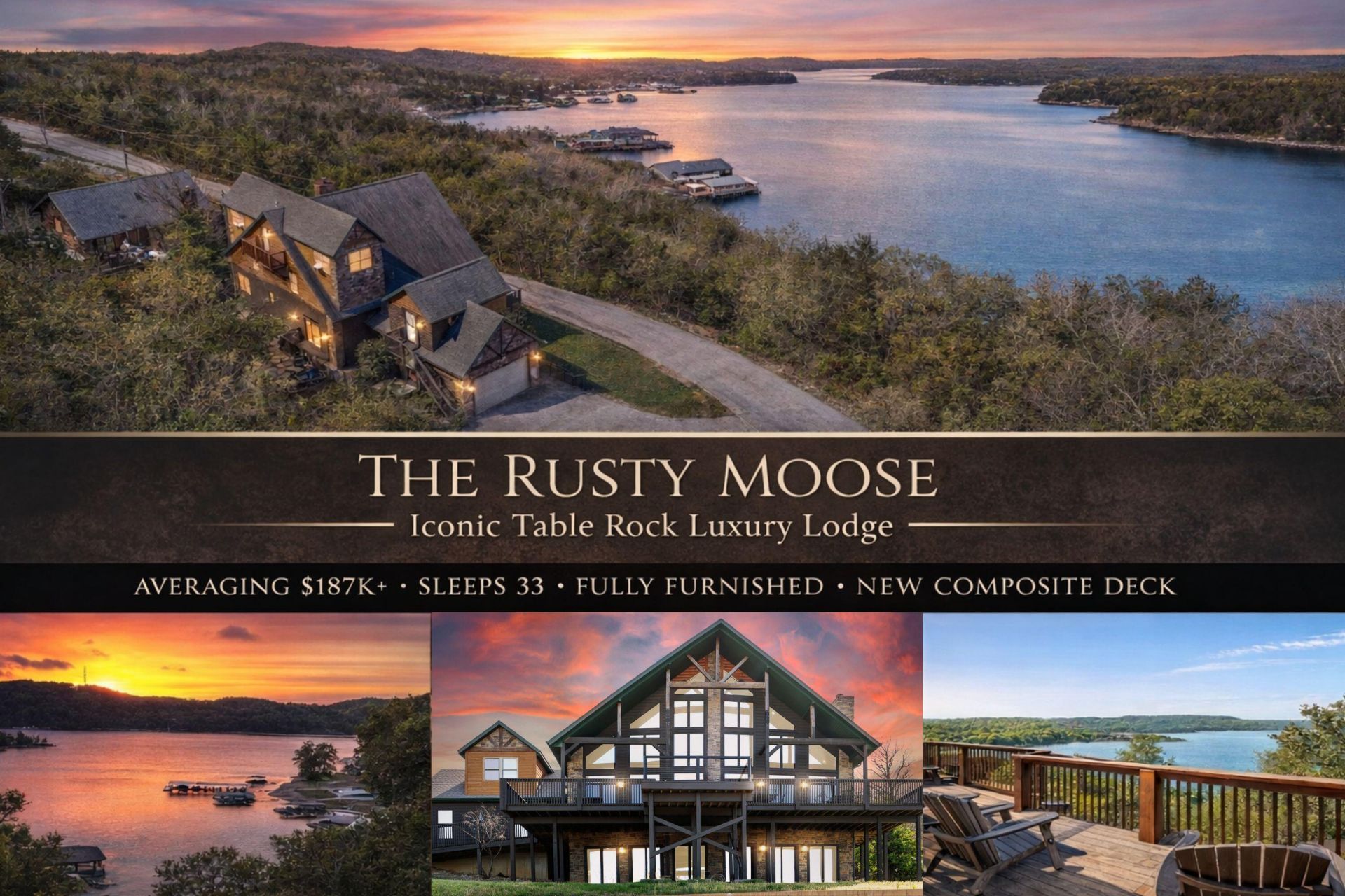 Welcome to The Rusty Moose, a one of a kind luxury lodge with iconic Table Rock Lake views and a proven high performing investment profile. Recent capital improvements include new flooring across 3 levels, a new composite deck, and 1 of 2 HVAC systems recently replaced. Producing an average of $187,000 per year in rental revenue, this fully furnished turnkey asset stands among the strongest performing vacation rentals on Table Rock Lake.Set on a quiet road and perched on over half an acre of prime lakeview property, this 6,000 square foot custom lodge offers breathtaking panoramic water views and unforgettable award winning sunsets. With 8 bedrooms, 7 bathrooms, and accommodations for up to 33 guests, it is ideally designed for large groups, family reunions, weddings, retreats, and high demand stays.Inside, soaring 30 foot windows flood the open concept living spaces with natural light while framing the lake from nearly every room. A dramatic grand stone fireplace anchors the main living area, creating the perfect blend of rustic elegance and unforgettable lodge character. Rich wood finishes, professionally curated furnishings, and intentional design details elevate the guest experience throughout.A massive expansive lakeview deck creates seamless indoor outdoor living and gives guests front row seats to some of the most stunning sunsets on Table Rock Lake. Offered fully furnished and ready to perform from day one, this is more than a home, it is a rare income producing experience buyers cannot easily replicate.A separate carriage house above the garage adds even more flexibility for additional guest accommodations.Offered fully furnished and ready to perform from day one, this is more than a home, it is a rare income producing experience buyers cannot easily replicate. Proven year after year to generate an average of $187,000 in annual rental revenue, the heavy lifting has already been done, with 2026 bookings already beginning to build.