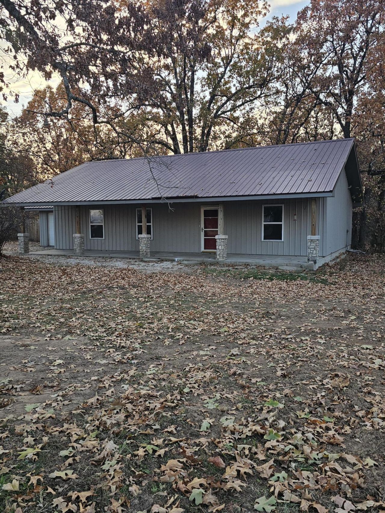 Two bedroom, two bath home on 2.57 acres with scattered shade trees around the home. The inside has painted concrete floors and new carpeting with newer windows, newer electric range, microwave and refrigerator. The open floor plan includes huge family room, dining area and enters into the kitchen with bar. Lot of cabinets with large utility room including a washer and dryer. The entire insides of the home is freshly painted. From the family room step outside on to a 8' x 46' covered front porch overlooking large shade trees. The home has maintenance free metal siding, metal roof ,storage shed, one car attached garage, storage shed and a 18' x 35' storage barn. Private well and septic.