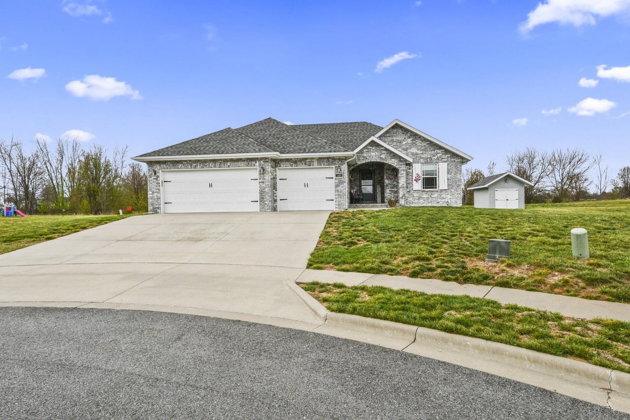 Welcome home to this beautifully maintained 3- bedroom, 2-bath property perfectly situated on a quiet cul-de-sac with no rear neighbors- offering peaceful views of a large, open field right in your backyard.From the moment you arrive, you'll love the charming brick front and inviting covered front porch with an elegant archway- perfect for relaxing mornings or evening unwinding. Step inside to an open- concept layout that seamlessly connects the living room and kitchen, highlighted by an electric fireplace; and durable luxury plank vinyl flooring throughout the main areas.The kitchen is both stylish and functional, featuring white cabinetry, a classic subway tile backsplash, granite countertops, and a large center island ideal for gatherings and entertaining. A spacious pantry adds extra convenience, and all appliances- only 3 years old- and washer/dryer are included.The primary suite offers a comfortable retreat with double sinks and a walk-in shower in the en-suite bathroom. Additional features include pull-down attic access with abundant storage space.Car enthusiasts and hobbyists will appreciate the oversized 3- car garage, complete with built-in storage cabinets, a dedicated workspace, and three radiant heaters- keeping the space warm and usable year-round.Enjoy outdoor living in the backyard with partial white vinyl fencing for added privacy, a large concrete pad, and a newer deck ( just 1 year old)- perfect or entertaining or relaxing. Needing more storage? The backyard has a shed complete with electric and built on a concrete slab. Located close to everything Republic has to offer, this move-in ready home truly checks all the boxes.Don't miss your chance to make it yours!